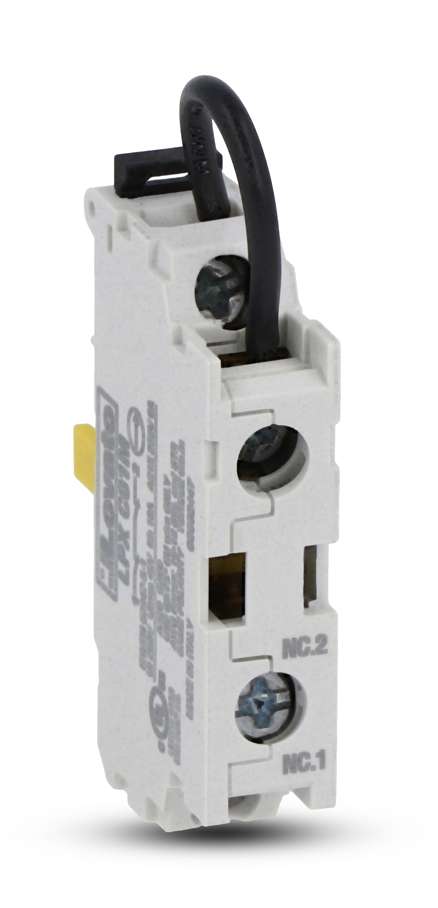 1 Normally closed (NC) contact: Dedicated to the standard emergency stop command, activated when the mushroom pushbutton is pressed.